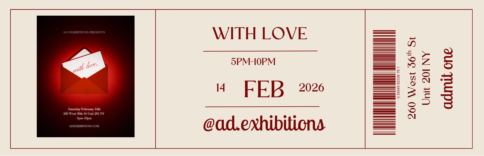 With Love is an immersive Valentine’s Day art exhibition celebrating love, passion, and connection. Guests will experience themed artwork, interactive moments, and a romantic atmosphere throughout the evening.